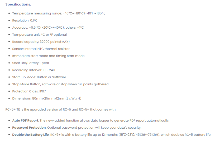 RC-5+ is a multi use auto pdf report temperature data logger without external temperature probe from Elitech in the USA. Widely used in the cold chain for temperature verification of goods during transit or storage.