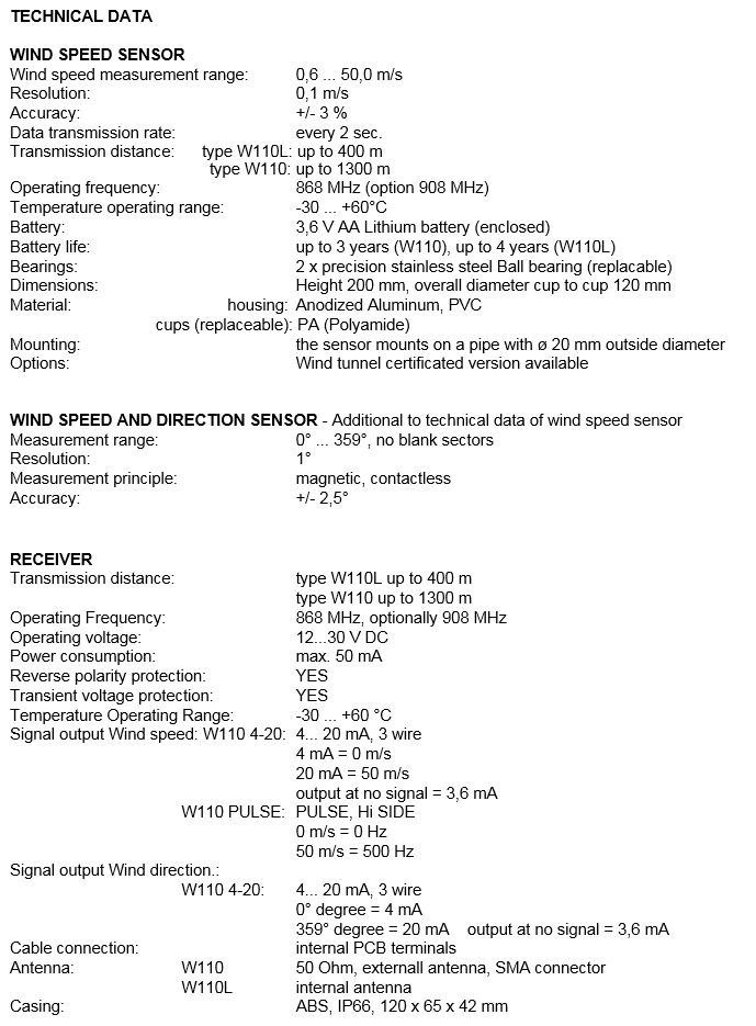 W110L/WSD – WIRELESS ANEMOMETER (4-20mA Output)