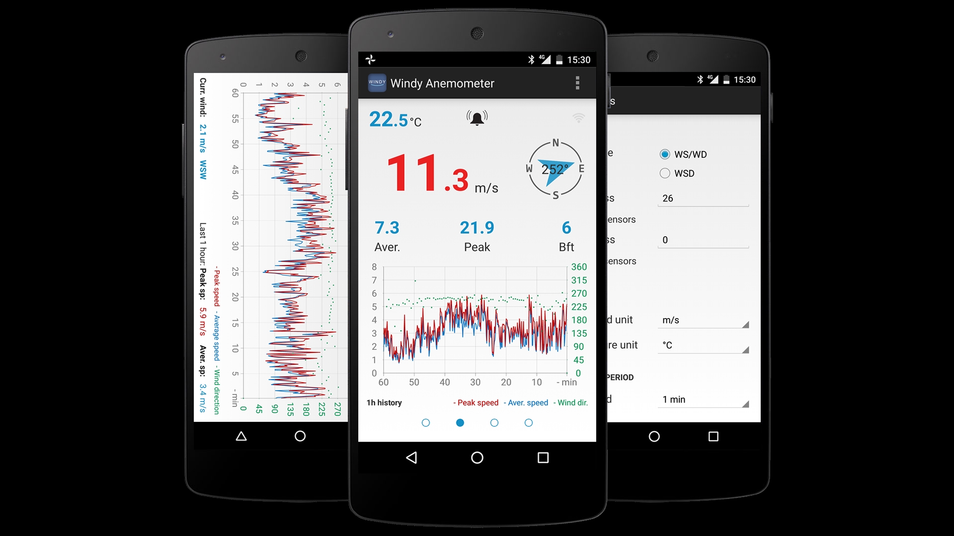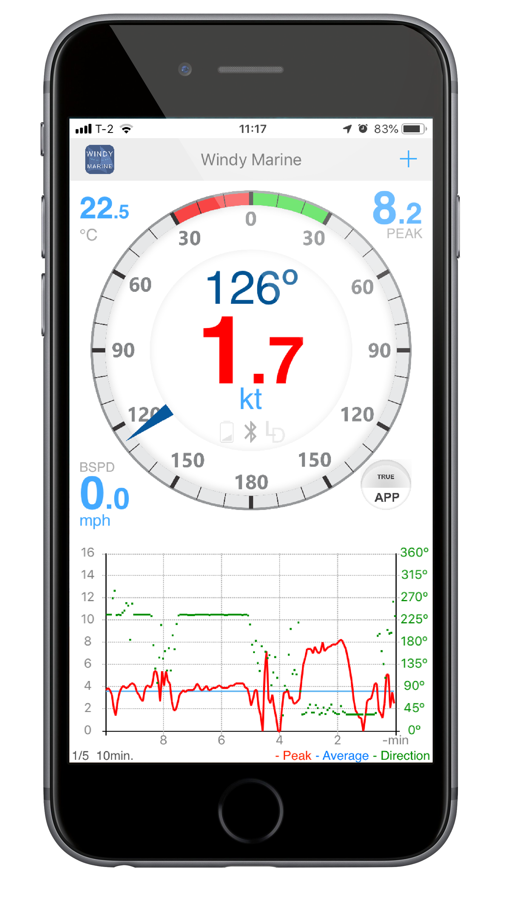 - Apps displays current, average, peak wind speed, wind angle, wind direcon, temperature and history graphs