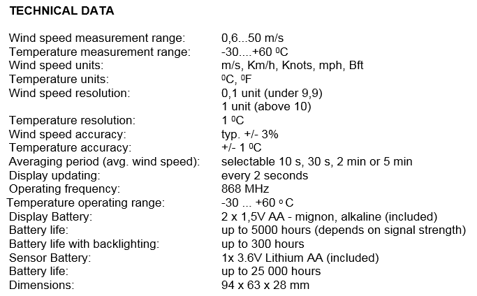 WR3-B – WIRELESS ANEMOMETER (Single audible alarm)
