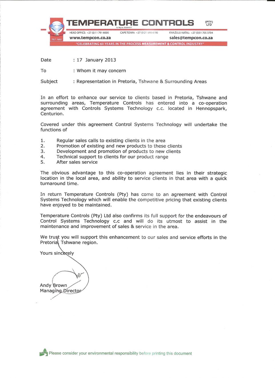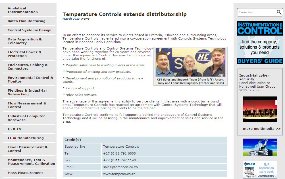 January 2013: CST appointed Pretoria Sales House for Temperature Controls